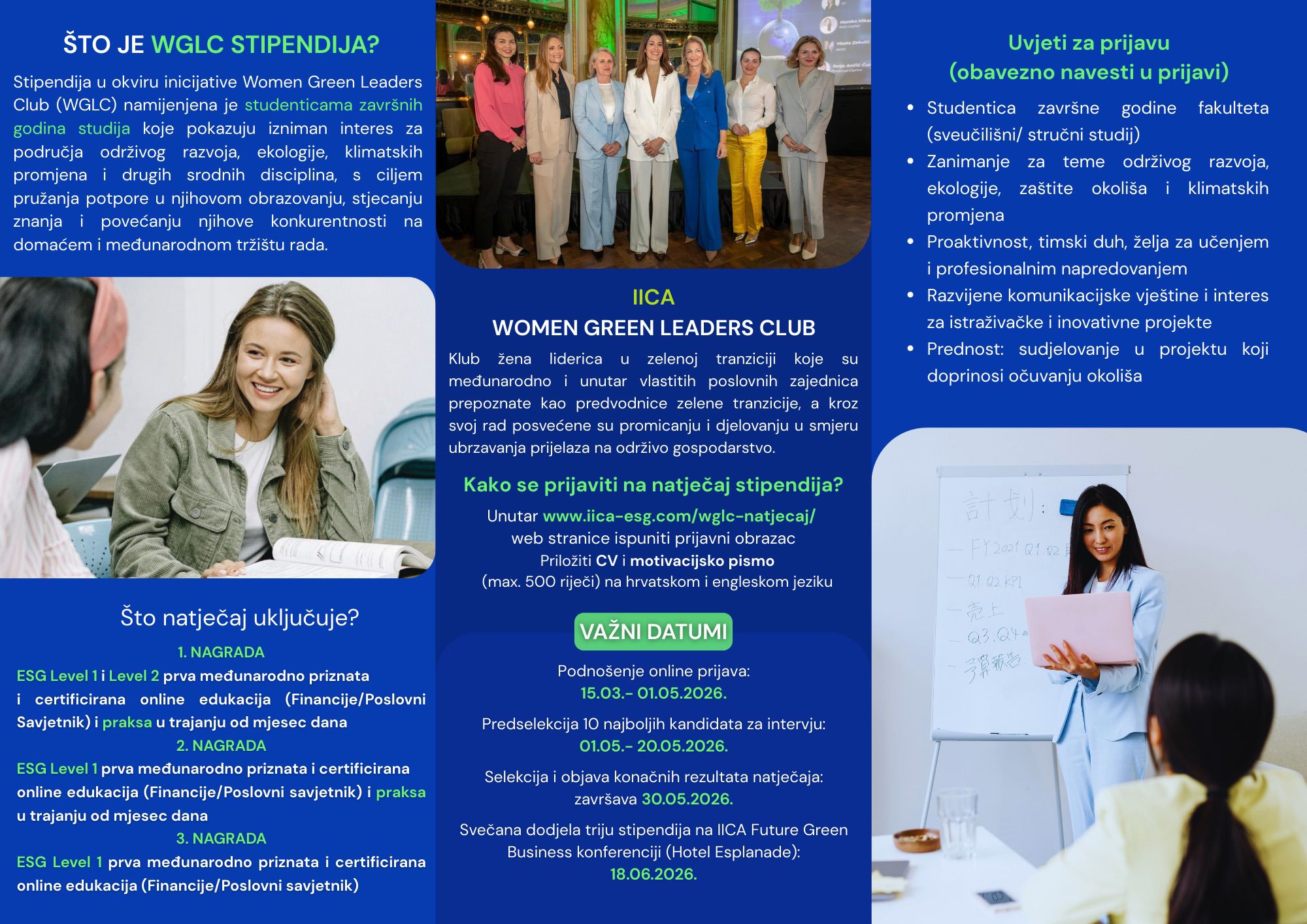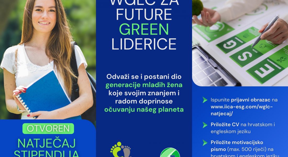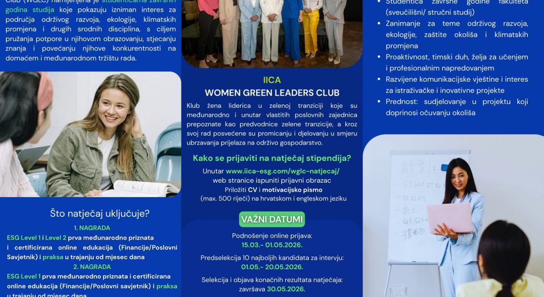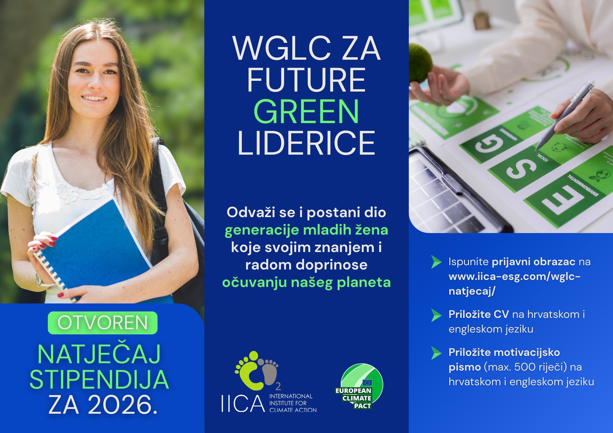 Ovaj jedinstveni natječaj usmjeren je prema mladim ženama koje žele postati buduće liderice u području održivosti, klimatskih promjena i ESG-a (Environmental, Social and Governance) i pruža im priliku za međunarodno priznate online edukacije i praktična iskustva u trajanju od mjesec dana. Prijave se vrše putem web stranice www.iica-esg.com/wglc-natjecaj/ a studentice su dužne priložiti životopis i motivacijsko pismo (maksimalno 500 riječi) na hrvatskom i engleskom jeziku.
