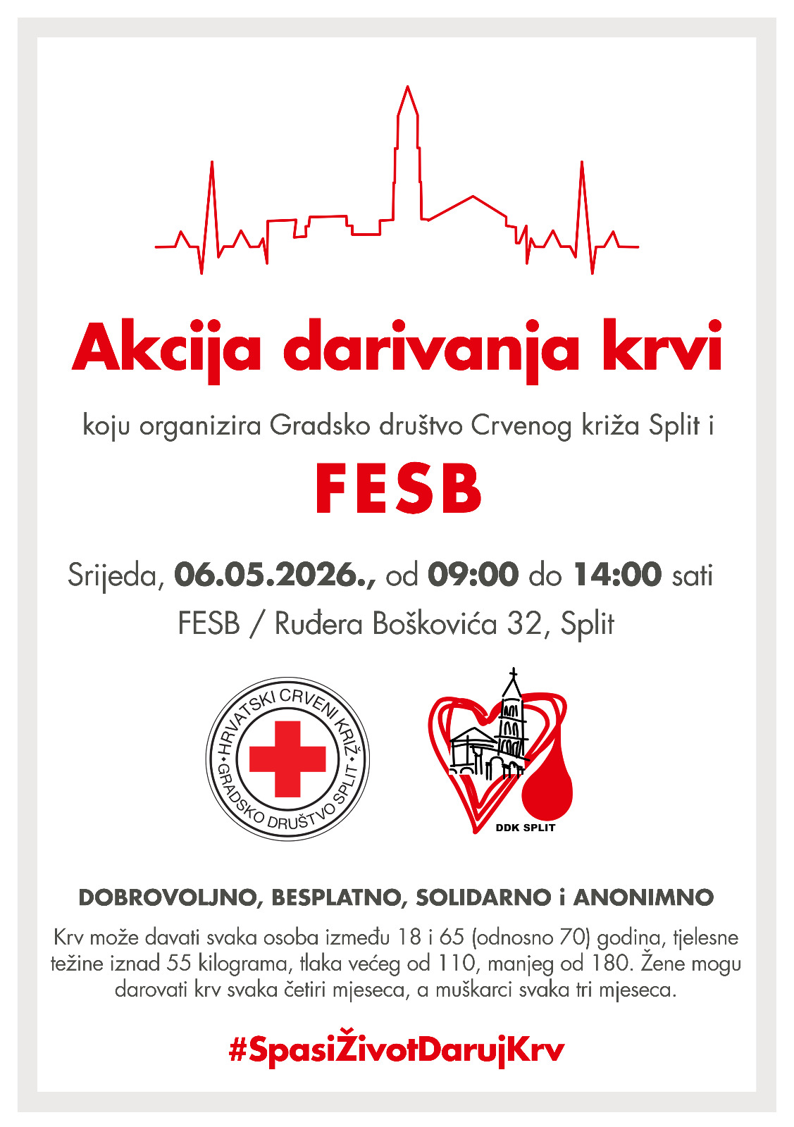 Crveni križ Split i FESB organiziraju akciju darivanja krvi koja će se održati na dan 06. svibnja 2026. godine (srijeda) od 09:00 do 14:00 sati u prostorijama A242 i A243.